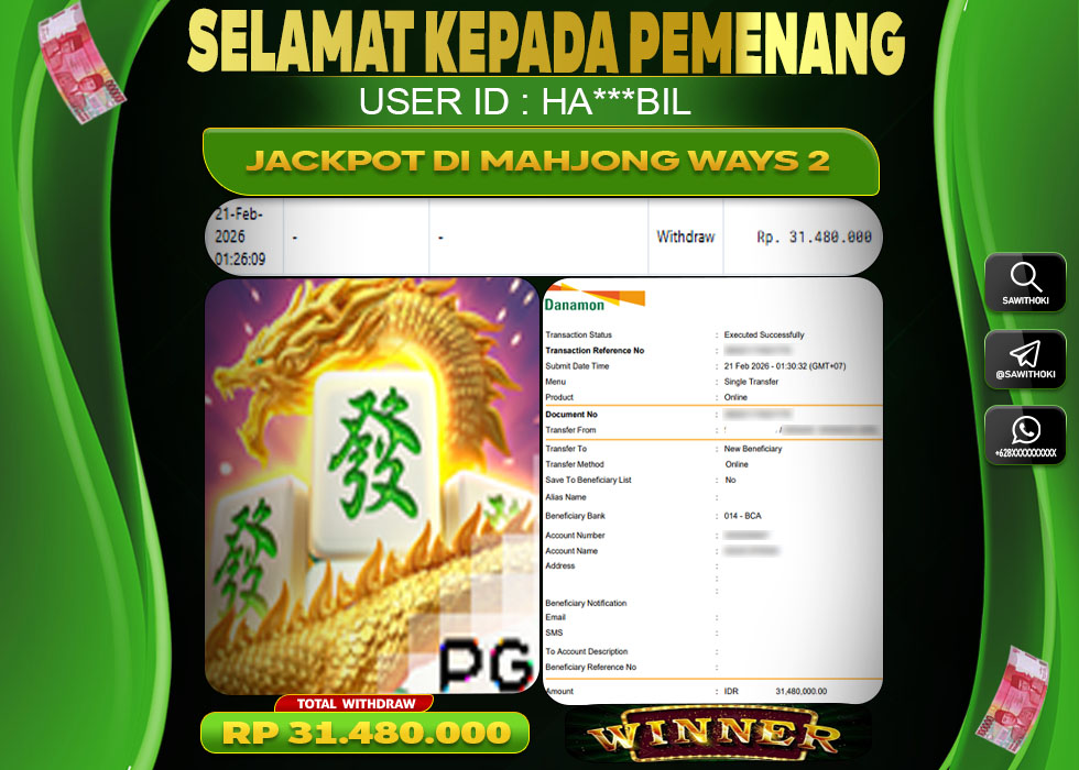 Bukti Jackpot Slot Online SAWITHOKI Sabtu 21 February 2026 – SAWITHOKI adalah bo online terpercaya. Berikut ini kami berikan info bukti jackpot member SAWITHOKI yang sudah kami bayar lunas dalam permainan slot online.
