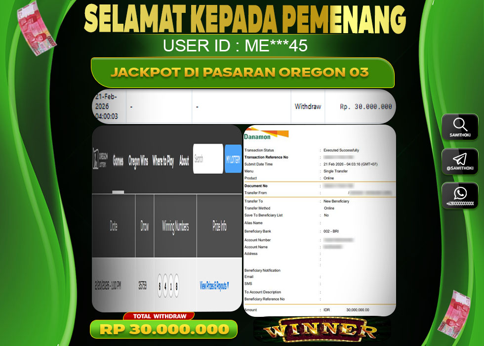 Bukti Jackpot Togel Online SAWITHOKI Sabtu 21 February 2026 30.000.000 - LUNAS