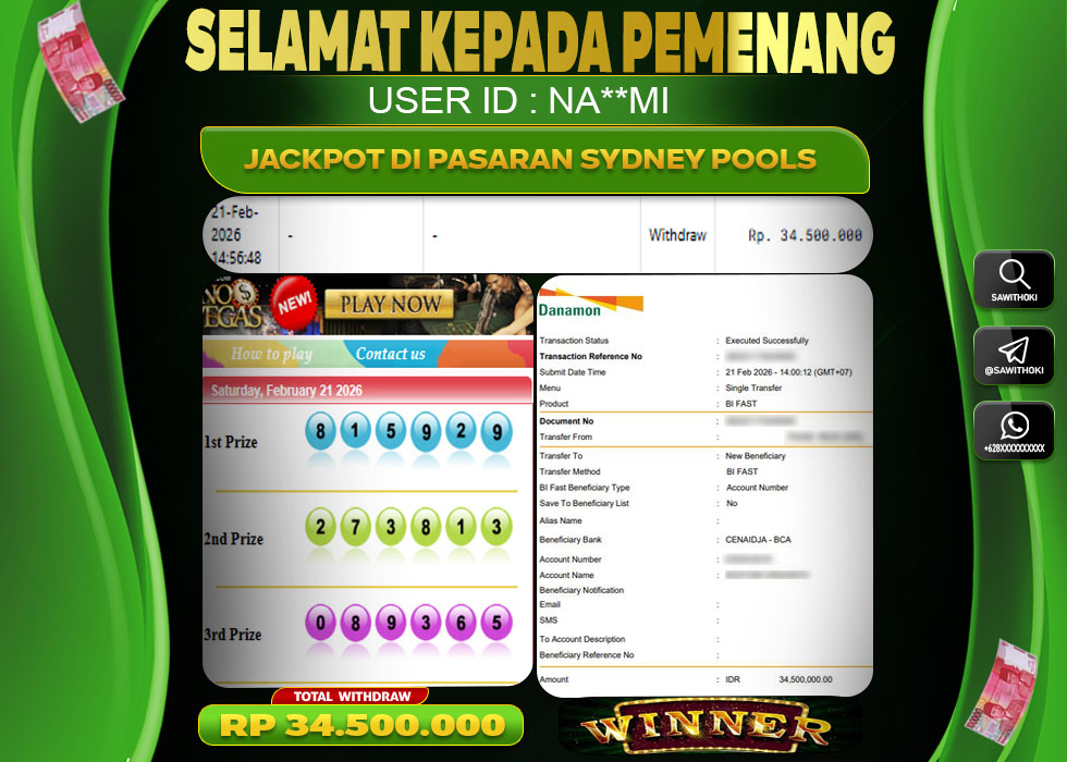 Bukti Jackpot Togel Online SAWITHOKI Sabtu 21 February 2026 – SAWITHOKI adalah bo online terpercaya. Berikut ini kami berikan info bukti jackpot member SAWITHOKI yang sudah kami bayar lunas dalam permainan Togel Online.