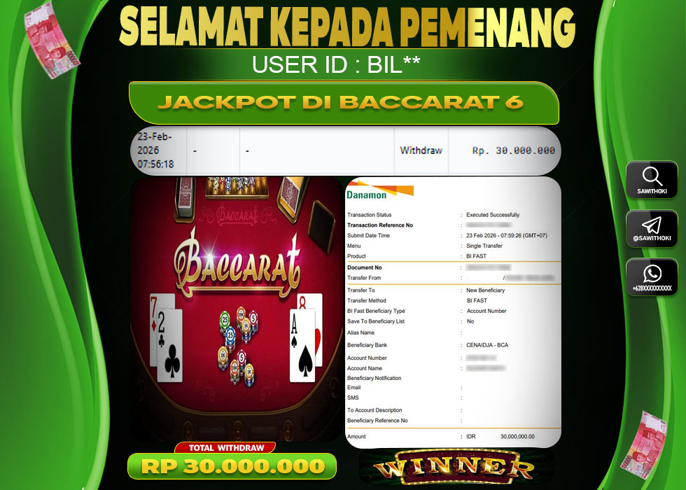 Bukti Jackpot Live Casino Online SAWITHOKI Senin 23 February 2026 – SAWITHOKI adalah bo online terpercaya. Berikut ini kami berikan info bukti jackpot member SAWITHOKI yang sudah kami bayar lunas dalam permainan live casino online.