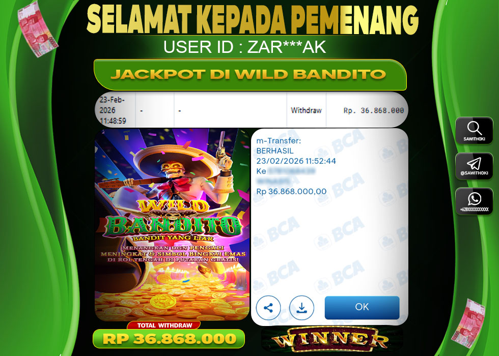 Bukti Jackpot Slot Online SAWITHOKI Senin 23 February 2026 – SAWITHOKI adalah bo online terpercaya. Berikut ini kami berikan info bukti jackpot member SAWITHOKI yang sudah kami bayar lunas dalam permainan slot online.
