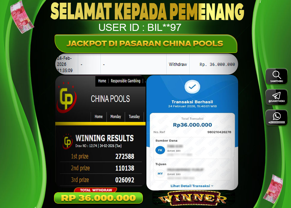 Bukti Jackpot Togel Online SAWITHOKI Selasa 24 February 2026 36.000.000 - LUNAS