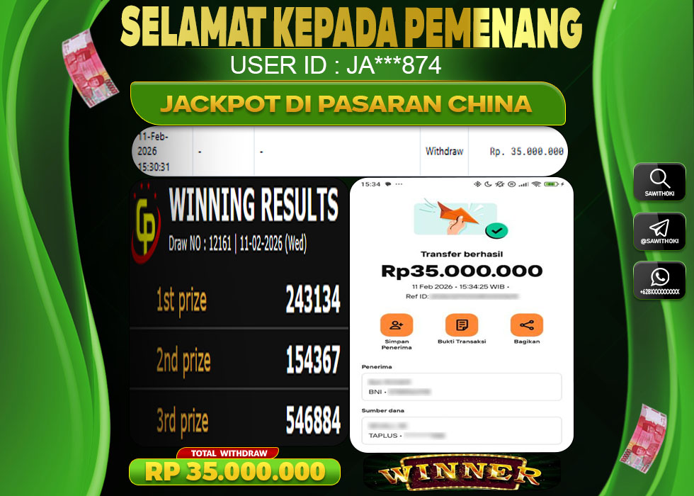 Bukti Jackpot Togel Online SAWITHOKI Rabu 11 February 2026 – SAWITOKI adalah bo online terpercaya. Berikut ini kami berikan info bukti jackpot member SAWITOKI yang sudah kami bayar lunas dalam permainan Togel Online.