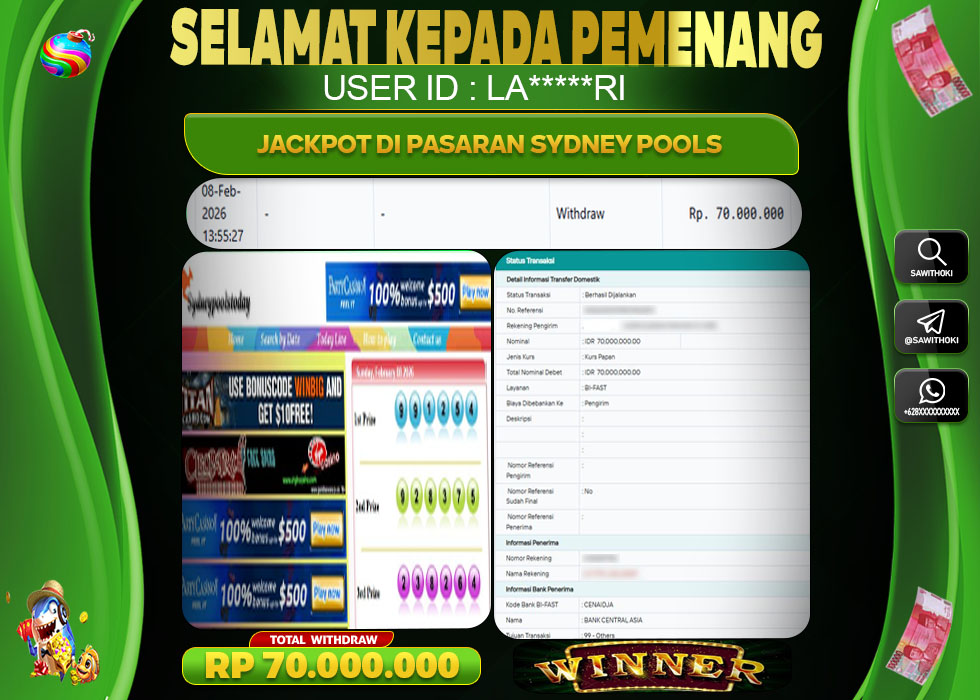Bukti Jackpot Togel Online SAWITOKI Minggu 08 February 2026 – SAWITOKI adalah bo online terpercaya. Berikut ini kami berikan info bukti jackpot member SAWITOKI yang sudah kami bayar lunas dalam permainan Togel Online.