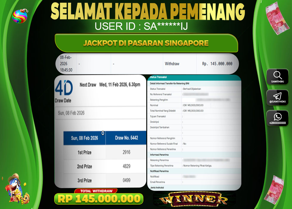 Bukti Jackpot Togel Online SAWITOKI Minggu 08 February 2026 145.000.000 - LUNAS