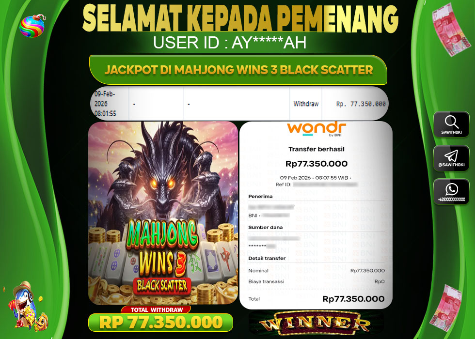 Bukti Jackpot Slot Online SAWITOKI Senin 09 February 2026 77.350.000 - LUNAS
