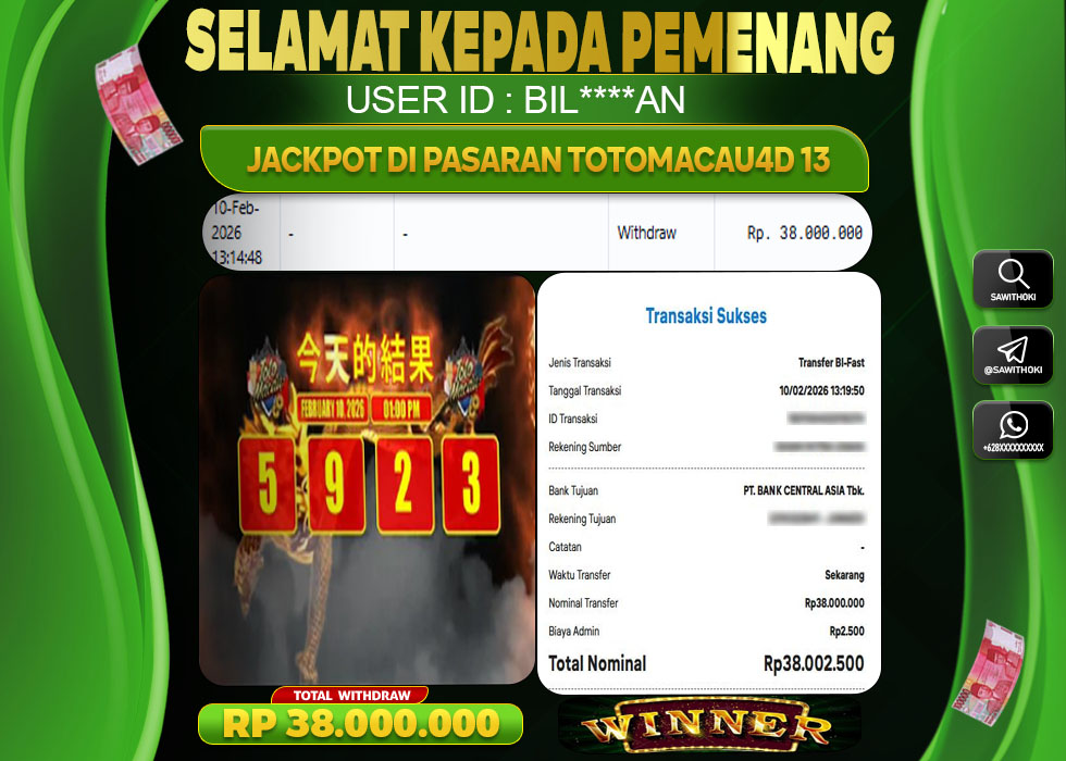 Bukti Jackpot Togel Online SAWITOKI Selasa 10 February 2026 38.000.000 - LUNAS