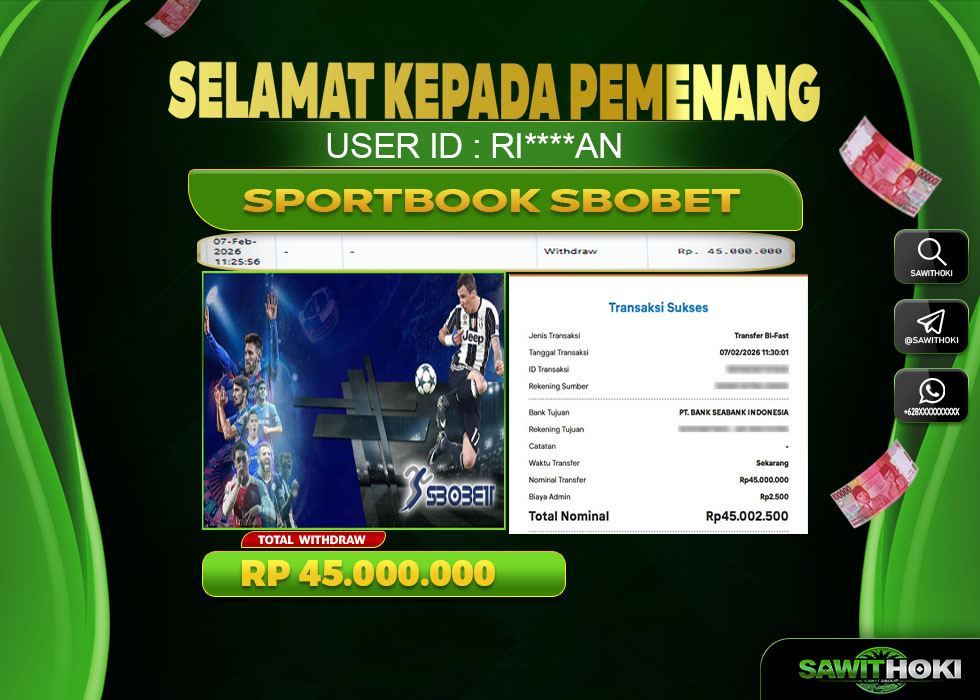 Bukti Jackpot SPORTBOOK Online SAWITOKI Sabtu 07 February 2026 45.000.000 - LUNAS